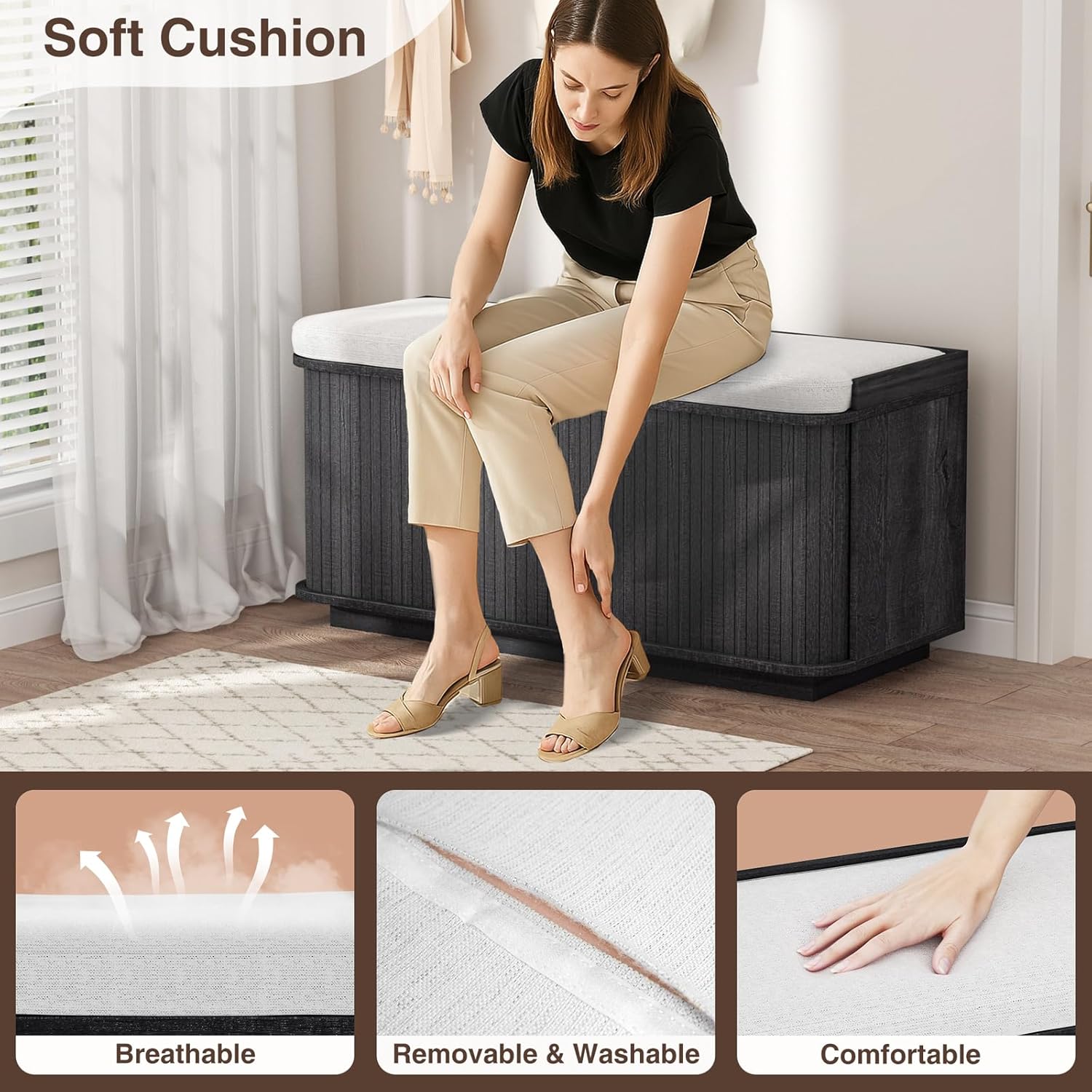 - Padded Cushion: Our benches with storage have 5 cm thick highly resilient foam upholstery with removable and washable linen covers for comfort and convenience when changing shoes