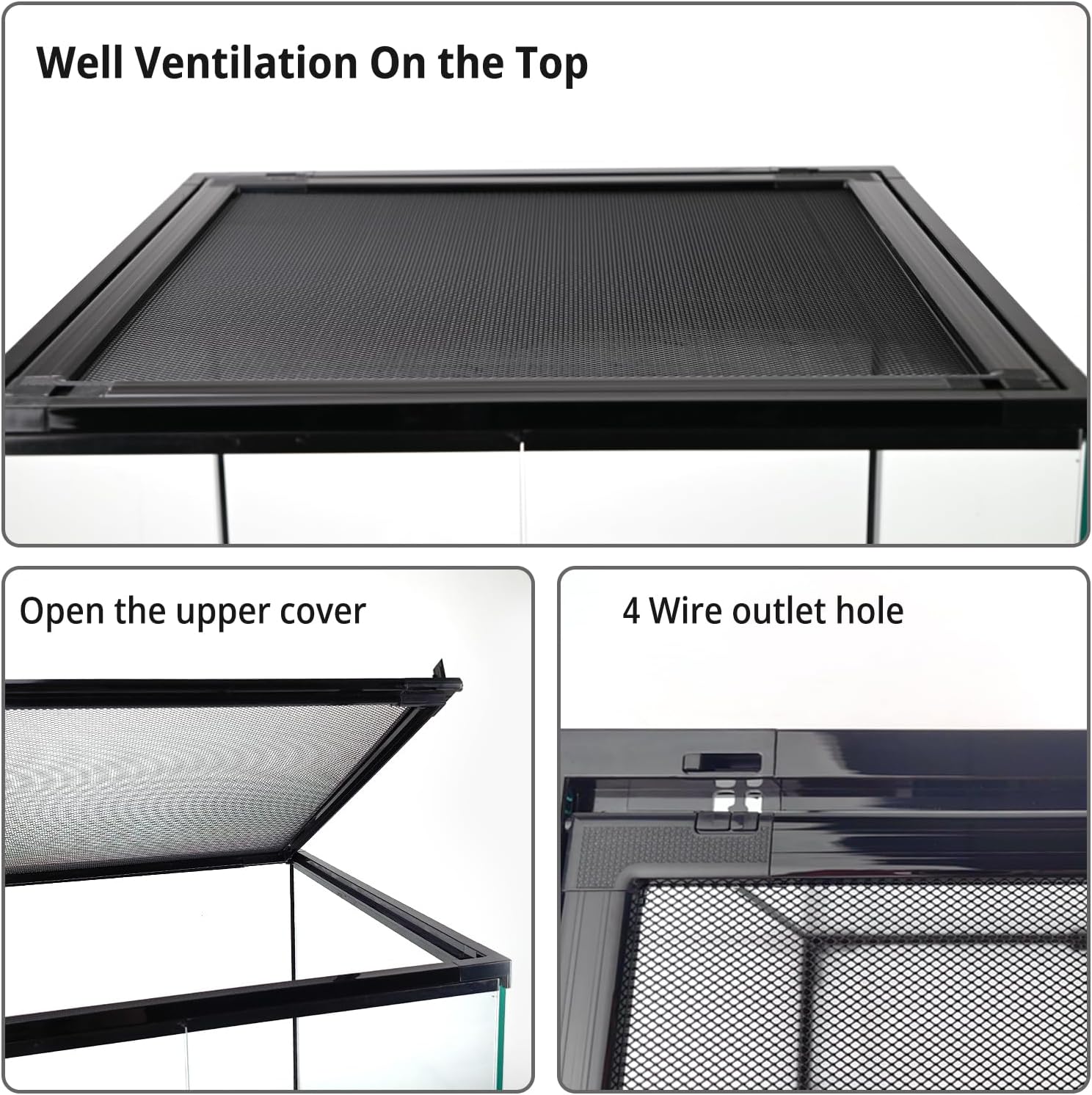 - 【Metal Mesh Top Ventilation】:Features a removable metal mesh screen top, providing optimal airflow and ventilation for your pet. Allows excellent penetration of UVB and natural sunlight, and accommodates dome light fixtures. Includes cord ports for easy wiring.