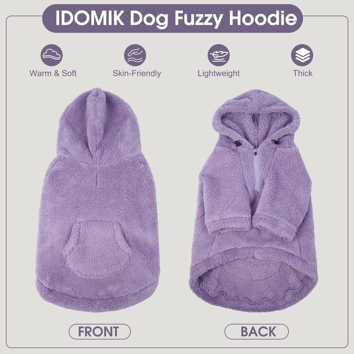IDOMIK Fuzzy Dog Sweater with Adjustable Hood, Warm Fleece Dog Sweater Hoodie with Harness Hole & Pocket, Pullover Sweaters for Medium Dogs, Fuzzy Hooded Sweatshirt for Fall Winter Christmas,Purple,L