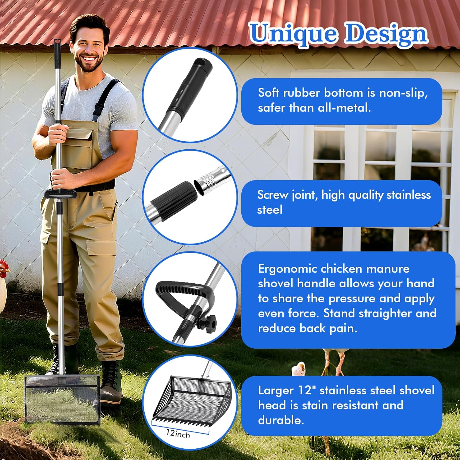 - Large-Capacity Metal Chicken Poop Scooper : Constructed with a heavy-duty metal shovel head and rake, paired with a 304 stainless steel handle and an adjustable soft rubber grip, it is suitable for use year-round. The metal-toothed chicken manure shovel head measures 12 inches in width, with a curved groove design significantly increasing the shovel's capacity, enabling it to scoop and sift waste in a single pass, greatly enhancing work efficiency.