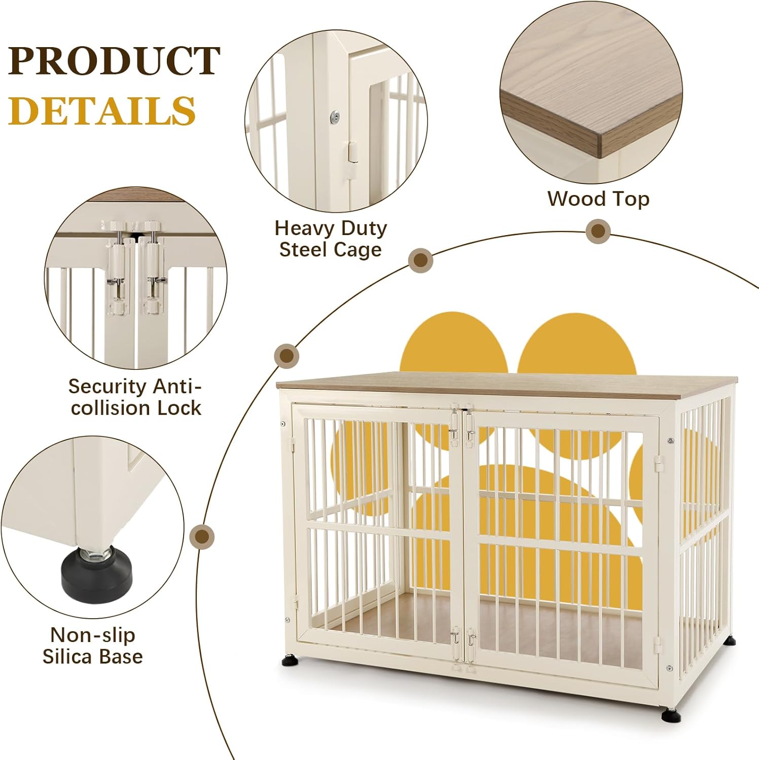 - Sturdy and Chew-Resistant: The design of the thickened metal fence can effectively prevent dogs from chewing, increase the firmness and not easy to deform. The large dog crate combines heavy-duty wood panels and metal to ensure sturdy and stable for long-term use. The top provides extra storage space for pet supplies and other decorative items. The top supports a maximum weight of 200 lbs