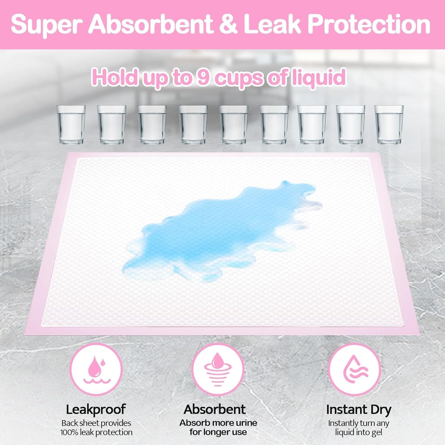 - 🌫【Quick-Drying Technology】 With a super-absorbent core and quick-dry surface, these pads prevent tracking, liquid overflow, and bad odors. Unique flash-dry technology quickly turns liquid into gel, preventing tracking, liquid overflow, and bad smell, making them suitable for all-day use without discomfort.non-woven fabric top layer of training pads is for fast absorbency, which absorbs liquid instantly and prevents overflow.